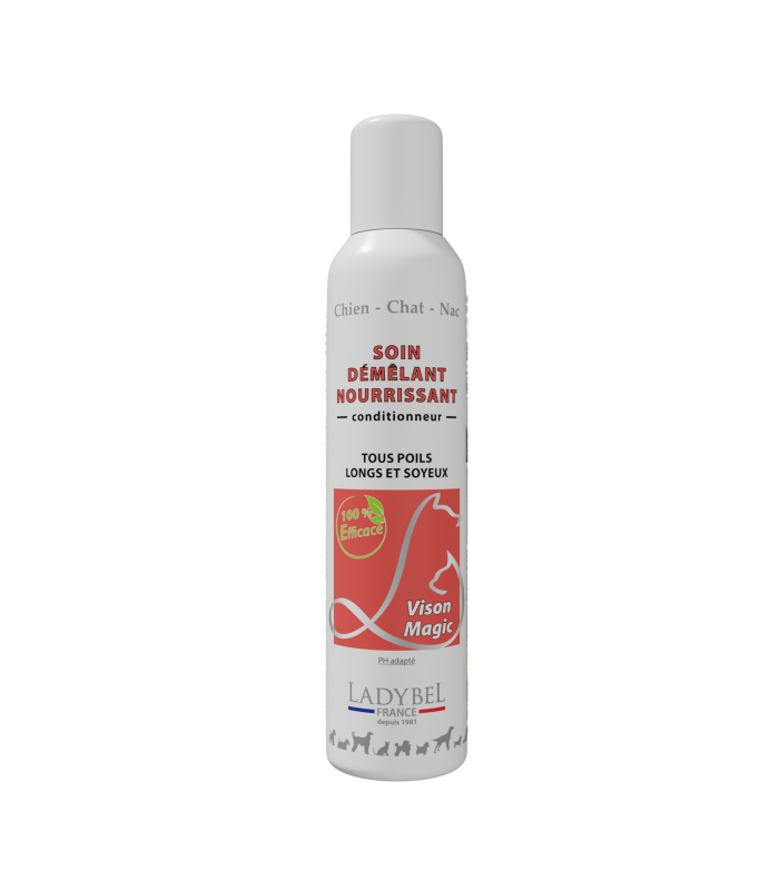 This Vison Oil conditioner contains vitamins E and a sun-filtering screen. It protects colors, deodorizes, facilitates detangling and promotes hair growth or regrowth. It makes the hair soft, supple, shiny and prevents it from felting and breaking. It does not weigh down and can therefore be used before an exhibition, but above all for the usual and regular maintenance of dogs with long and precious fur. It is also used as anointment before bathing. Instructions for use Spray Vison Magic while holding the aerosol about 20 cm away from the animal. Gently brush to penetrate the product to the root and smooth the hair. Use regularly once or twice a week. Avoid spraying towards the eyes and muzzle. Do not apply to irritated skin. Delivery in metropolitan France and Europe only.